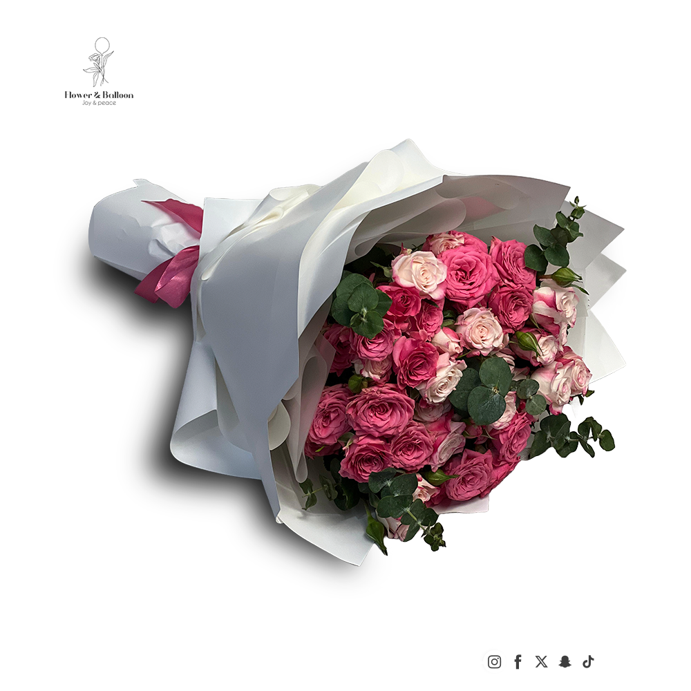 • ورود وردية داكنة وزهرية فاتحة: تخلق توازنًا متناغمًا بين العمق والنعومة، مما يمنح الباقة مظهرًا أنيقًا ودافئًا.
