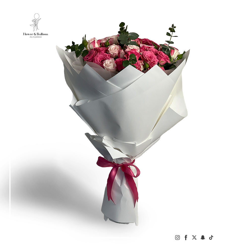 • غلاف أبيض أنيق بشريط وردي فاخر: يعكس أناقة التصميم ويجعل الباقة تبدو كقطعة فنية متكاملة.